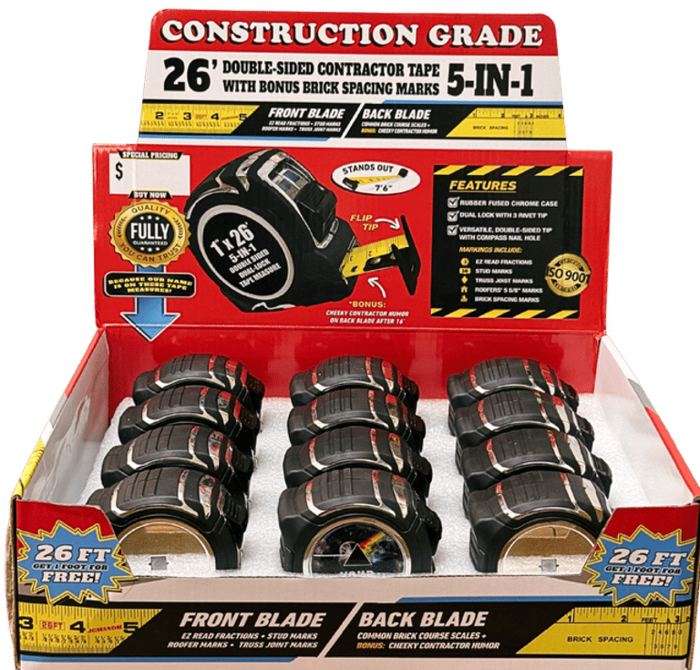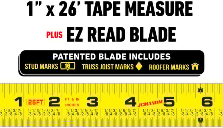 Featuring a dual lock, 3 Rivet tip with stainless Steel bottom plate and blade that stands horizontal out to 7' 6", our affordable 1" x 26' Contractor Tape Measure can't be beat!